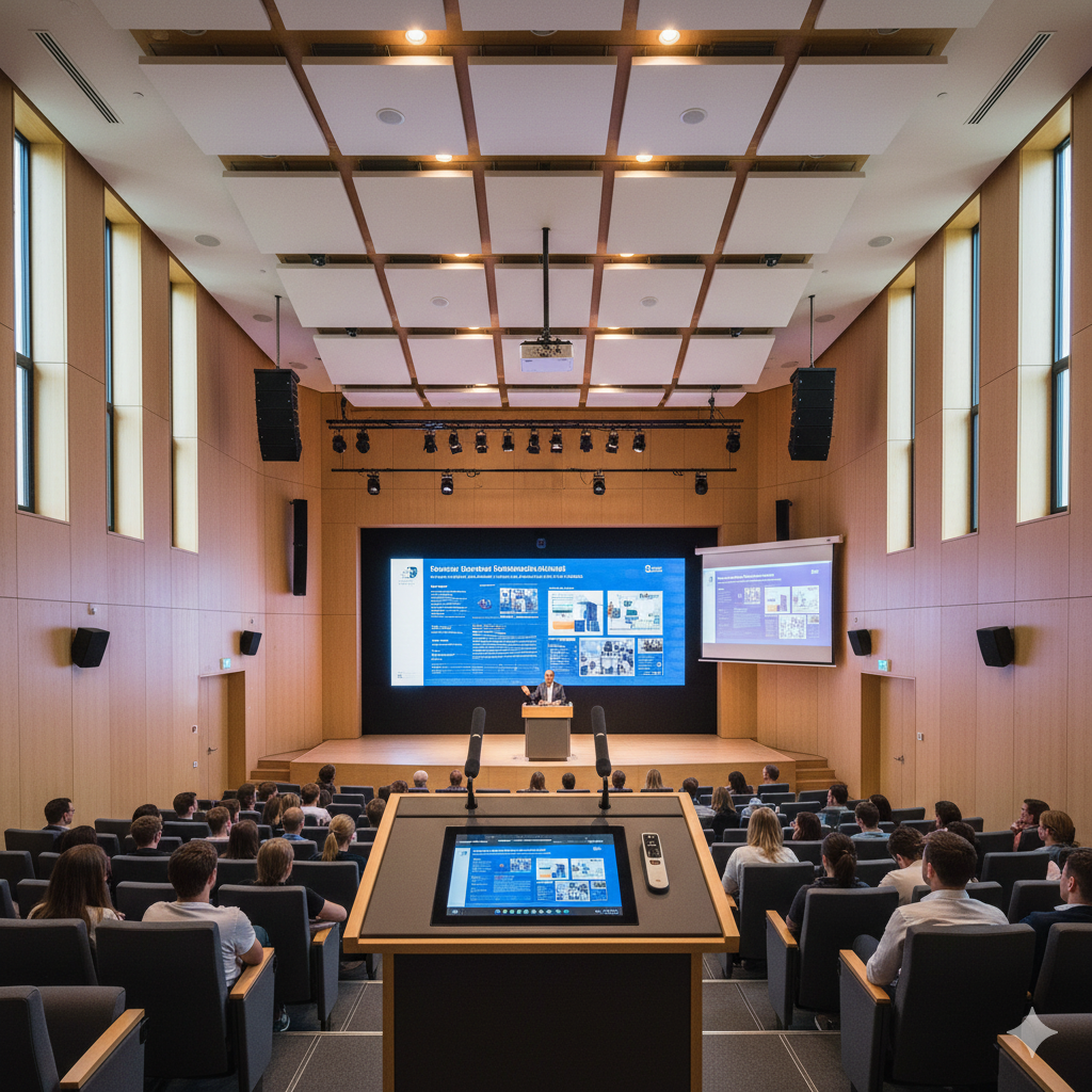 Mittelgroße Konferenzräume erfordern ausgewogene AV-Konzepte für Präsentation, Videokonferenzen und Audioqualität. Zentrale Herausforderungen sind Sprachverständlichkeit, Kamerapositionierung und flexible Signalverteilung. Typische Lösungen umfassen großformatige Displays oder Projektoren, Deckenmikrofone, leistungsfähige Lautsprecher und Mediensteuerungen. Durch strukturierte Medientechnik lassen sich hybride Meetings, Präsentationen und Team-Workshops zuverlässig und professionell umsetzen.